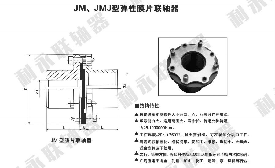 JM型膜片聯(lián)軸器是 具代表性的金屬擾性聯(lián)軸器,它在各種機械設備上都可以采用。其膜片采用0.3~2mm厚的 高強度不透鋼薄板鉚制成組件,上面有4~16個鉸制孔,用螺拴分別與主、從動法蘭聯(lián)結(jié)。運行中膜片受拉、壓、扭應力。這種聯(lián)軸器制造成本低,傳遞扭矩范圍大,力學性能好,裝拆方便,對安裝精度要求不高,它集中體現(xiàn)了擾性聯(lián)軸器的優(yōu)點,可廣泛應用于各種領(lǐng)域,適應多種工況條件,例如泵、風機、軋機、造紙機械、電力機械、水泥機械、船舶工業(yè)、航空航天等。由于其減振性能好、傳動平穩(wěn),在各種行業(yè)的應用中, 普通的贊同和采用,尤其是在造紙行業(yè)中,它能使您生產(chǎn)出的紙張 加平整、光滑、質(zhì)量大幅度提高,使您能夠始終 一步,同時也是發(fā)電廠、石化廠、水泥廠、軋鋼廠、礦山等進行技術(shù)改造、替代進口、節(jié)能降耗的 佳選擇。