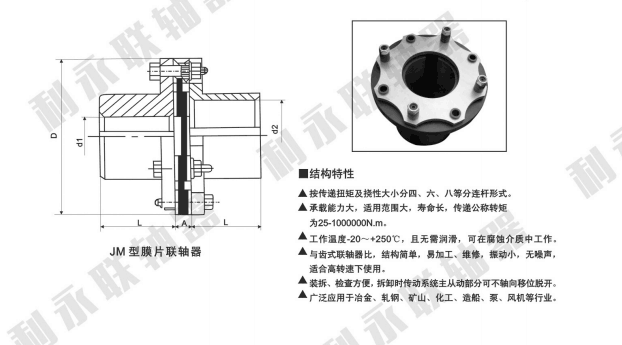 單膜片聯(lián)軸器廣泛用于各種機械裝置的軸系傳動,如水泵(尤其是大功率、化工泵)、風機、壓縮機、液壓機械、石油機械、印刷機械、紡織機械、化工機械、礦山機械、冶金機械、航空(直升飛機)、艦艇高速動力傳動系統(tǒng)、汽輪機、活塞式動力機械傳動系統(tǒng)、履帶式車輛,以及發(fā)電機組高速、大功率機械傳動系統(tǒng),經(jīng)動平衡后應用于高速傳動軸系已比較普遍。